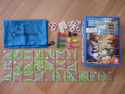 La boîte contient 24 nouvelles tuiles terrain, 20 jetons marchandise, un sac en tissu, et 12 meeples aux couleurs des joueurs et représentant cochons et bâtisseurs (notez que ceux du sixième joueur sont de couleur rose pour cette édition, et ainsi qu’ils ne sont pas accordés à l’ancienne édition…).