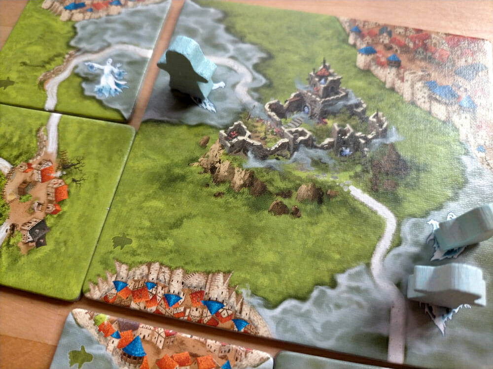 On pourra contrôler en partie l’arrivée des fantômes, et surtout leur récupération. En niveau accessible, nous en aurons 15, puis 13 si on cherche une tension accrue. Il sera possible (et souhaitable) de les récupérer en fermant complètement une zone de brouillard. Contrôler les fantômes pour ne pas perdre. En parallèle, il faudra construire des points de victoire, d’une façon toute Carcassonnienne : fermer des routes, des villes, encadrer des châteaux. Petite subtilité qui vaut son pesant d’or, si on joint une ville par exemple sur laquelle un autre joueur avait déjà posé son meeple, on double les points, une autre voie pour marquer pas mal de points et grimper rapidement la piste de score vers le nombre requis de Points de Victoire du niveau choisi.