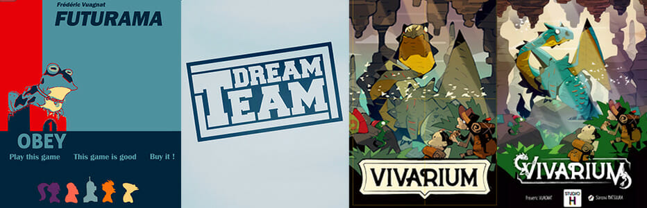 Côté thématique, nous savions dès le début que nous n’allions pas garder mon thème d’une équipe de super personnages de multi licences. J’ai donc laissé carte blanche à l’éditeur pour trouver une idée qui lui plaisait. On a évoqué ensemble plusieurs thèmes improbables, comme des équipes de ninjas qui entreprendraient des missions, ou même des aliens qui viendraient enlever des spécimens et objets humains pour les étudier (en mode loufoque « je récupère la tour Eiffel »). À force de brainstorming, ils m’ont parlé de l’illustrateur Satoshi Matsuura, dont ils avaient repéré le travail (Hidden Leaders n’était même pas encore en participatif à l’époque), j’ai tout de suite craqué sur ce design super original. Son bestiaire d’animaux improbables collerait très bien avec une aventure/expédition dans un monde inconnu. Nous avons décidé que cela se passerait à la fin du XIXe siècle, et que l’idée serait de répertorier les espèces inconnues. Nous voulions à tout prix éviter que les joueurs jouent des chasseurs qui collecteraient des espèces pour les exposer, donc nous avons imaginé ce concept d’une guilde scientifique qui serait missionnée pour aller les étudier dans leur monde natal : Vivarium était né.