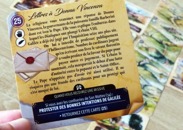 Dans la gamme Cartaventura (qui a débuté en 2021 avec Lhasa de Thomas Dupont & Arnaud Ladagnous – notre article), on a souvent un petit gimmick qui vient changer nos habitudes. Ici, le changement provient du système de correspondance via des missives. Tout au long de votre périple, vous recevrez des lettres envoyées par des interlocuteurs répartis aux quatre coins de l’Italie.