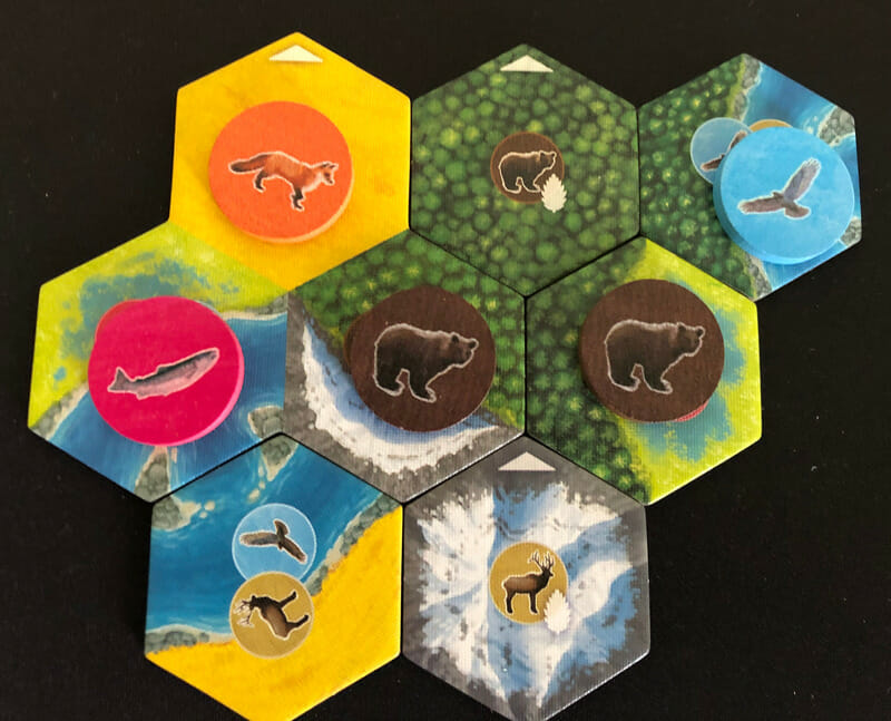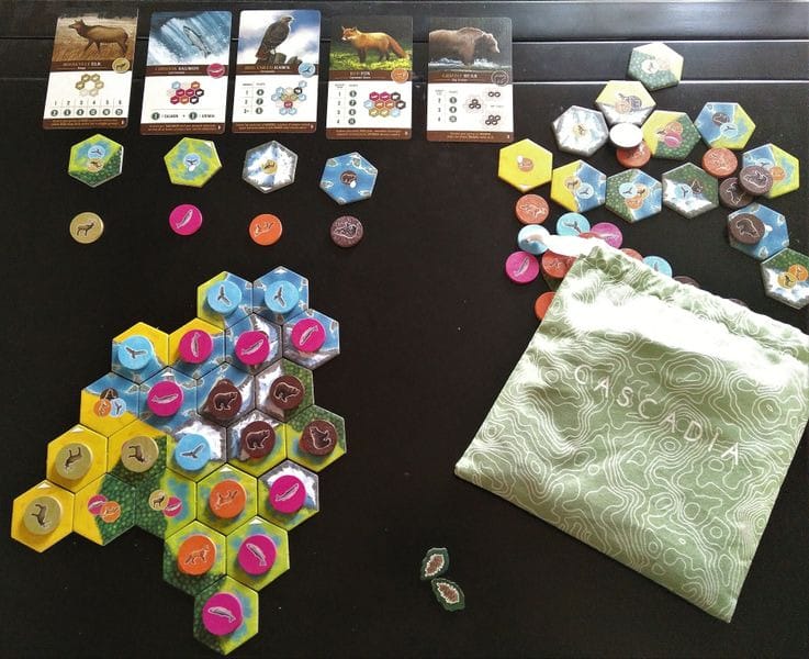 Cascadia initialement paru en 2021 sous bannière Flatout Games (localisé par Lucky Duck) est un jeu de placement imaginé par Randy Flynn où vous placez vos tuiles environnement (forêt, prairies, etc) de façon à ce que vos jetons animaux trouvent un habitat qui leur sied et vous rapportent ainsi un max de points selon diverses façon de scorer. Les objectifs de la faune sont déterminés au hasard par l’une des quatre cartes de score pour chaque type de faune et vous marquez aussi des points pour la plus grande surface de chaque type d’habitat à la fin de la partie, avec un bonus si votre groupe est plus grand que celui de l’autre joueur. Un jeu très accessible, fluide, avec une jolie rejouabilité, bref des qualités qui lui ont permis de décrocher la grande récompense du Spiel des Jahres en 2022. Pour en savoir plus notre Just played est sous la main.