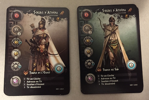 Là où on commence à entrer dans le spécifique, c’est sur la composition des armées : on peut, comme dans la plupart des jeux d’affrontement avec figurines depuis la nuit des temps, composer son armée sur la base d’unités qui coûtent chacune un certain nombre de points. On constitue ainsi de manière assez simple des armées qui sont censées être de forces équivalentes, puisque construites avec le même budget en termes de points. Ce premier point est déjà important en terme de rejouabilité, puisqu’on imagine rapidement qu’on va pouvoir composer des combinaisons intéressantes d’unités, de pouvoirs, etc.. D’un point de vue thématique, chaque joueur prend le rôle d’un commandant d’armée correspondant à une faction qui coïncide fondamentalement à l’une des déités du Panthéon grec : Athéna, Hélios, etc.. pour les gentils, et Achéron, Léthé, etc.. pour les méchants.