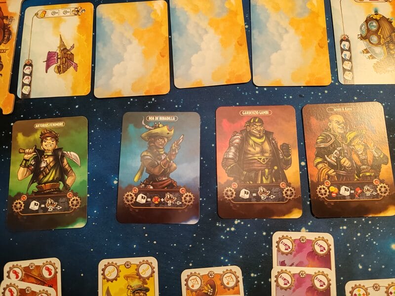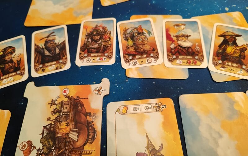 Chaque joueur devra donc arbitrer entre conserver certains objets ou personnages (l’aéronef ne pouvant accueillir qu’un nombre limité d’éléments ) et optimiser leur utilisation autant que possible… Puisque le jeu dépendant fortement du tirage imprévisible des cartes et des dés : il peut arriver qu’aucun fumigène ne soit utile ou que son utilisation échoue complètement. De même, les pièces sont inutiles en dehors des escales : si vous n’en effectuez pas, pourquoi les conserver alors qu’elles pourraient vous être précieuses face aux boss ?