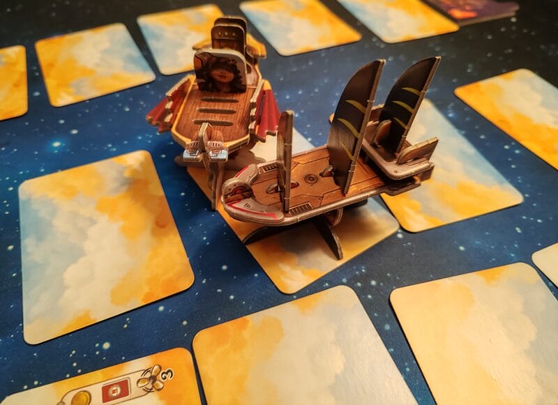 Premier constat : l’adaptation reste fidèle à l’œuvre originale. Les mécaniques de la monture multi se transposent avec élégance dans cette version conçue pour deux joueurs. On retrouve l’essentiel : désigner un capitaine, affronter des événements tirés aléatoirement aux dés, obtenir des récompenses et faire escale. Qu’impose alors cette version ? Elle s’appuie sur une dimension narrative renforcée, prenant la forme d’une course poursuite aérienne visant à rattraper des pirates – et à les affronter dans les versions avancées. Le jeu met en scène un vaisseau devant accueillir équipage, équipements et piles d’énergie en guise de points de vie. Mais surtout, il introduit un système de communication limitée, dont les contraintes génèrent beaucoup d’expressivité.