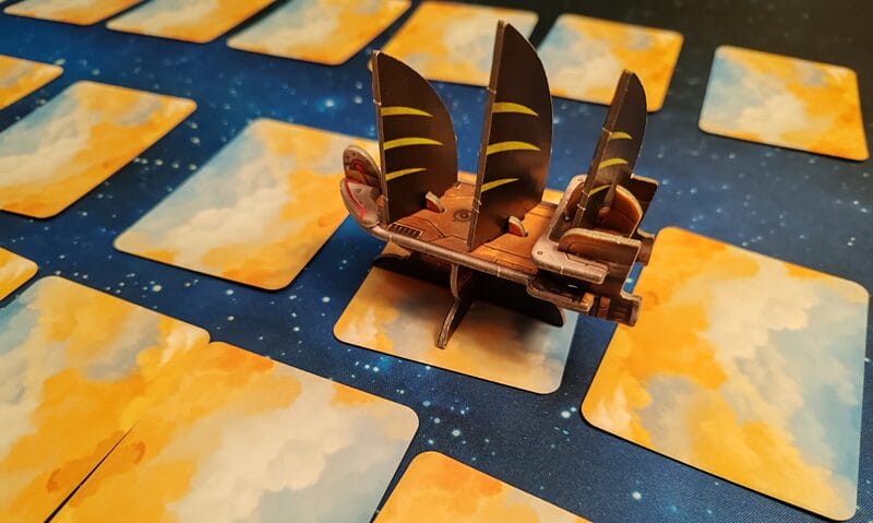 Celestia imposait une présence sur table remarquable, et cette version Duo l’intensifie. Désormais, ce ne sont plus un, mais deux aéronefs somptueux, qui surplombent un parcours de 27 cases — 25 cartes et 2 tuiles faisant office de départ et de repère pirate. Les joueurs s’élancent depuis la première case, tandis que le pirate démarre à la douzième. Toute la tension du jeu repose alors sur cette mécanique : atteindre l’ennemi avant qu’il ne gagne son repère.