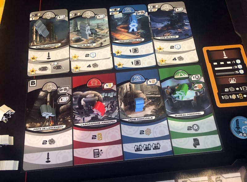 Là où c’est doublement malin, c’est que les actions disponibles sur le plateau sont accessibles aussi sur nos cartes et parfois en mieux. D’autant que les cartes que l’on va acheter peuvent être placées devant nous, ou sous une carte de la même couleur déjà placées (on améliore notre avant base). Quand on y enverra un ouvrier, il réalisera les deux actions, parfois en dépensant des ressources. Les amoureux de l’optimisation fiscale spatiale seront aux anges.
