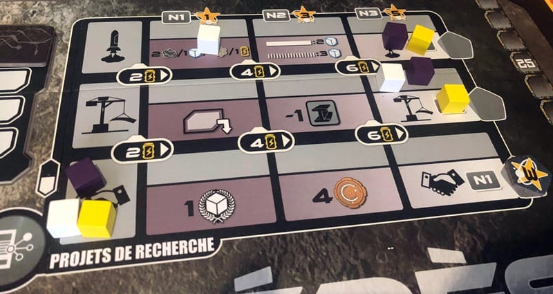 Ce n’est pas un arbre technologique gigantesque. On n’a que trois entrées différentes et trois niveaux pour chaque, mais cela offre des choix vite importants tout de même. Un axe à ne pas négliger d’ailleurs car selon la stratégie que l’on souhaite mettre en place, on pourra faire l’économie de ressources ou bien avoir une action bonus et c’est toujours bon à prendre. En revanche c’est coûteux en l’énergie (la ressource), et il faut en avoir pour avancer en niveau.