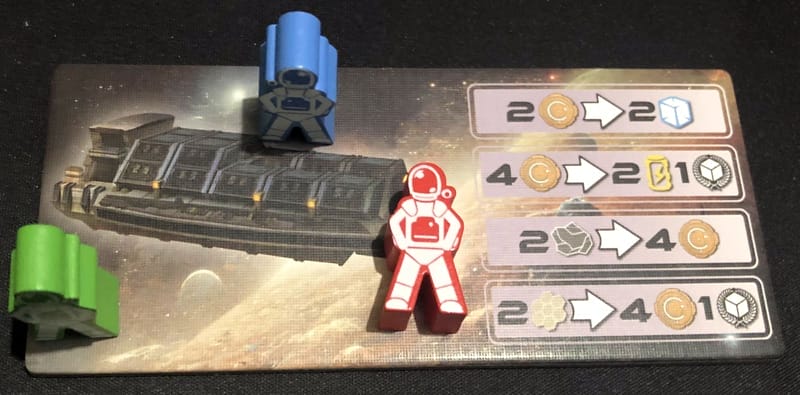 Chaque joueuse débute avec ses cinq jetons leader (des jetons ouvriers) et son plateau d’avant base, plus quelques ressources. De la pose d’ouvriers bloquante classique : je pose un de mes jetons leader quelque part et je réalise l’action. Chaque lieu étant limité (en fonction du nombre de joueurs), je dois bien arbitrer où aller d’abord.