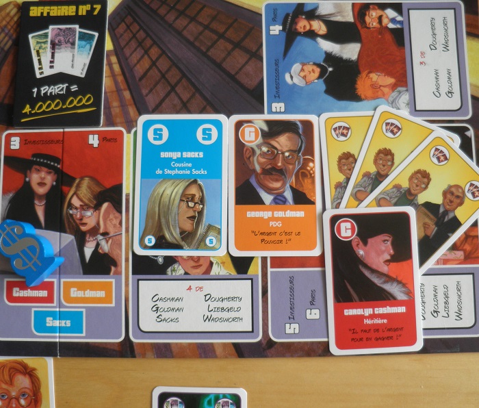 Exemple : cette négociation peut être menée par moi seul : je possède Goldman et Wadsworth (le lunetteux jaune dans le coin inférieur gauche. L’affaire en cours, celle sur laquelle le pion Dollar est posée, demande Cashman, Goldman et Sacks. Je peux avancer mon Goldman, jouer une Sacks temporaire et recruter la Cashman d’un autre joueur à l’aide de mes trois recrutements. Ces trois investisseurs me rapportent 4 parts, et chaque part vaut 4 millons de dollars. Si l’affaire se conclut ainsi sans contre, j’empoche seize millions de dollars avec ce coup d’éclat ! À grand renfort de cartes, tout de même. Bien entendu, je récupérerai mon Goldman en fin d’affaire. Les investisseurs de base ne sont pas défaussés, au contraire de leurs héritiers !