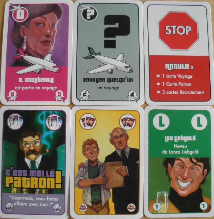 À tout moment, on peut envoyer un patron en voyage avec une carte Influence appropriée, ou jouer un membre de la famille d’un des investisseurs (ici Liebgeld), pour les remplacer temporairement. Ou, encore mieux, recruter, sans aucun partage possible, un Investisseur pour soi, avec un brelan de cartes recrutement (en jaune). Enfin, on peut se déclarer être le nouveau Patron de l’affaire, et donc avoir la prérogative de refaire les termes des marchés. Et, le tout, saupoudré d’annulations…