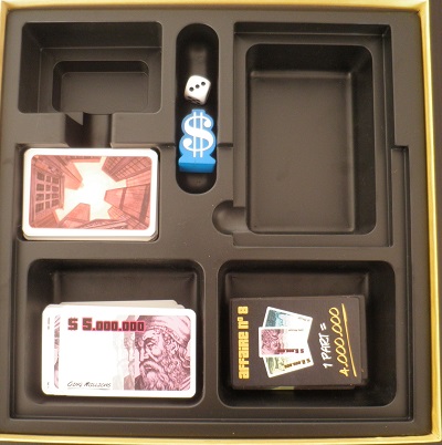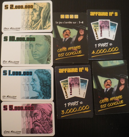 Le fric, plutôt sympa mais pas double-face pour que les ressources soient cachées, et les affaires, en carton toilé rigide plus épais (format tuile, quoi). On posera les tuiles sur le plateau pour fermer l’accès aux affaires déjà jouées. Notez : les affaires après la dixième ont de plus en plus de chances de finir le jeu.
