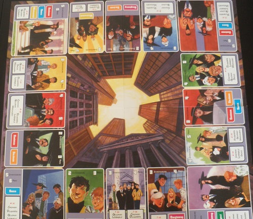 Le plateau, toilé, est plutôt joli et coloré. Chaque case représente une affaire potentielle, et firgure les différents courtiers du jeu.