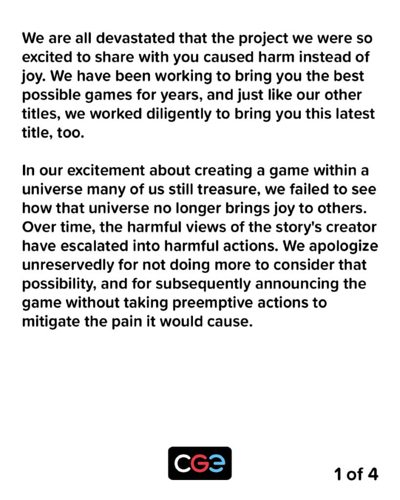 Dans notre enthousiasme à créer un jeu dans un univers que beaucoup d’entre nous chérissons encore, nous n’avons pas vu que cet univers ne procurait plus de joie à d’autres. Au fil du temps, les opinions préjudiciables de la créatrice de l’histoire se sont transformées en actions préjudiciables. Nous nous excusons sans réserve de ne pas avoir davantage pris en considération cette possibilité et d’avoir ensuite annoncé le jeu sans prendre de mesures préventives pour atténuer la douleur qu’il causerait.