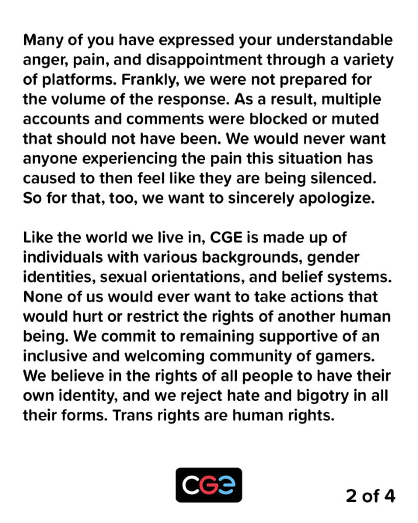 À l’image du monde dans lequel nous vivons, CGE est composé d’individus issus de divers horizons, identités de genre, orientations sexuelles et systèmes de croyances. Aucun d’entre nous ne souhaiterait prendre des mesures qui pourraient nuire ou restreindre les droits d’un autre être humain. Nous nous engageons à continuer de soutenir une communauté de joueurs inclusive et accueillante. Nous croyons au droit de chacun à avoir sa propre identité et nous rejetons la haine et le sectarisme sous toutes leurs formes. Les droits des personnes transgenres sont des droits humains.