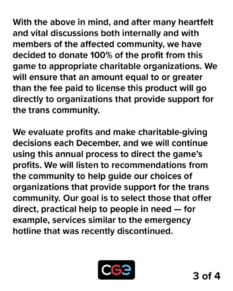 Compte tenu de ce qui précède, et après de nombreuses discussions sincères et essentielles tant en interne qu’avec les membres de la communauté concernée, nous avons décidé de reverser 100 % des bénéfices de ce jeu à des organisations caritatives appropriées. Nous veillerons à ce qu’un montant égal ou supérieur aux frais payés pour la licence de ce produit soit directement reversé à des organisations qui apportent leur soutien à la communauté transgenre.
