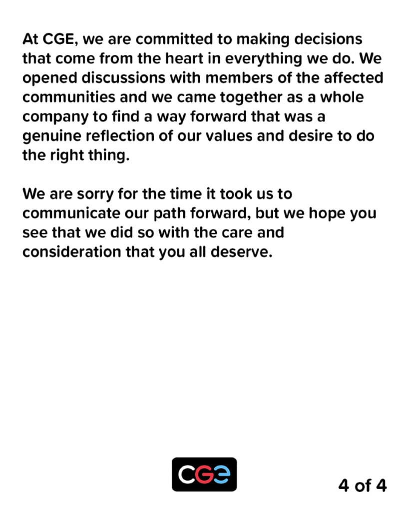 Chez CGE, nous nous engageons à prendre des décisions qui viennent du cœur dans tout ce que nous faisons. Nous avons entamé des discussions avec les membres des communautés concernées et nous nous sommes réunis en tant qu’entreprise pour trouver une voie à suivre qui reflète véritablement nos valeurs et notre désir de faire ce qui est juste. Nous sommes désolés du temps qu’il nous a fallu pour communiquer notre décision, mais nous espérons que vous comprenez que nous l’avons fait avec le soin et la considération que vous méritez tous. »