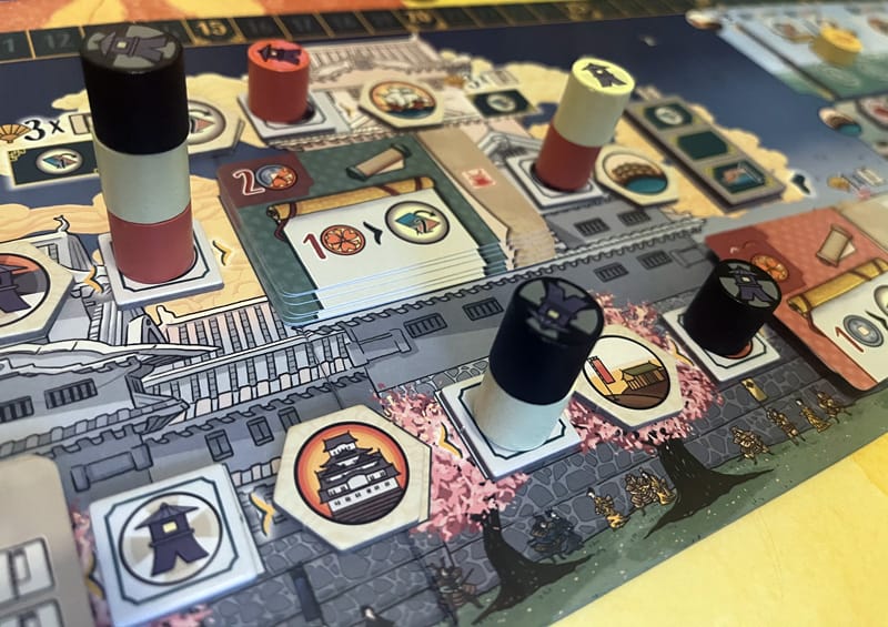 Notre courtisan cherche à grimper l’échelle sociale symbolisée par les étages du château Himeji. On va choisir un chemin parmi deux et monter de case en case, la case où il termine donne parfois un bonus. En fin de partie, il marque des points sur un principe là aussi de multiplicateur dépendant de l’étage atteint. L’autre joueur devra emprunter l’autre chemin et tant pis s’il aurait préféré emprunter le même, un peu d’interaction ne nuit pas.