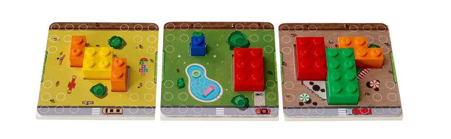 Chaque joueur reçoit trois terrains (plaques de construction) et trois cartes de paysage : une carte de maison verte, une carte scolaire jaune et une carte de supermarché marron. Les cartes de paysage sont placées à côté d’un emplacement vide.