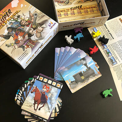 Fort de ce succès, l’auteur avec le concours de Cédric Lefebvre, crédité ici en tant que co-auteur, ont travaillé sur une version plus petite, plus rapide et directe. Colt Super Express était né. Un jeu pour 3 à 7 bandits où l’interaction est encore plus directe puisque pour gagner la partie il faudra être le dernier dans le train. Oui il va y avoir du grabuge et de l’élimination (très) directe !