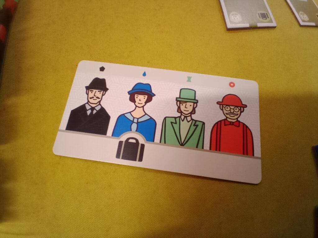 Chaque carte affiche trois ou quatre personnages colorés. L’un d’eux avec une icône valise. Il faut, en partant d’où on veut dans le navire, déposer à la suite, en adjacence, les meeples liés à la couleur, un essaimage qui doit coller à la carte témoin (le sens n’a pas d’importance, on peut lire de droite à gauche). Ici, suivant l’exemple, il faut poser un noir puis un bleu puis un vert et enfin un rouge, avec comme point de mire que la cliente bleue, a une valise et serait mieux dans une cabine si on veut bénéficier de l’avancée sur la piste bagages. On peut aussi partir de droite à gauche (rouge, vert…). Bien sûr, au premier tour, toutes les places sont disponibles et il n’y a aucun challenge. Par la suite, si un client ne peut être placé, il va chez les mécontents, une tuile hors plateau qui distribue des points négatifs.
