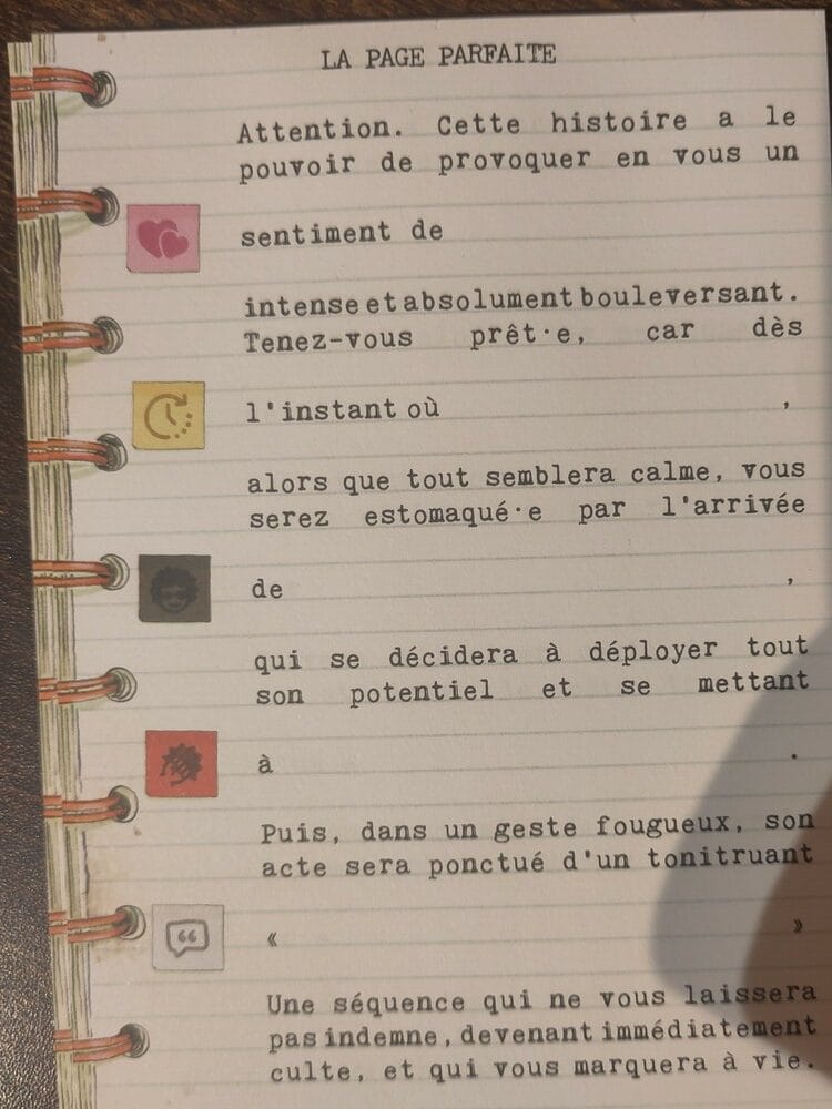 Reste le twist final que j’aime beaucoup : nous sommes des reporters qui faisons un sujet sur un élément particulier de la BD. Le résultat sera un reportage que l’on va compléter en remplissant les trous d’un texte que l’on ne connaît pas, on ne verra le résultat qu’à la fin. On retrouve la mécanique du « sens caché » de Nouvelles Contrées où une phrase devait résumer le livre. Sauf que, si dans ce précédent titre cette mécanique pouvait marcher superbement (allez jetez un œil ici) ou complètement rater, ici je trouve que cela marche plutôt bien, c’est comme le petit bonbon en fin de repas qui apporte la petite touche agréable finale.