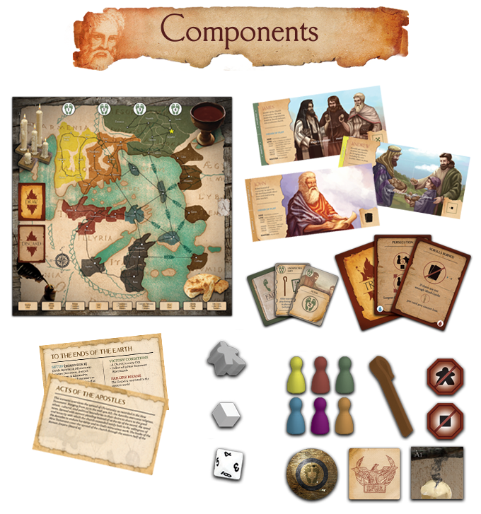 Il s’agit d’un jeu de plateau coopératif actuellement en souscription sur KS (et déjà founded s’il vous plait) qui vous propose de mettre vos pieds dans les chausses des Apôtres. Rien que ça. Vous vous servirez de vos cartes Foi pour contribuer à l’essor de la sainte Eglise et retrouver les exemplaires du Nouveau Testament, en prenant bien gare aux gladiateurs, aux lions et autres gouverneurs romains, sans oublier les désastres naturels qui vous barreront la route. Trouvez votre voie pour accomplir votre mission à temps, selon le scénario choisi, et si Dieu le veut bien sûr.