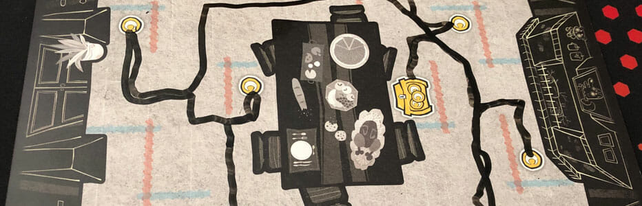 Un joueur cambrioleur aux lunettes rouges va tenir le crayon et tracer un trait, aiguillé par son complice aux lunettes bleues. Avant cela, nous avons le temps d’un sablier de 30 secondes pour observer, mémoriser, planifier, échafauder notre plan. Puis c’est parti pour 2 minutes d’adrénaline. OU 5 minutes de Ludochrono pour les règles en vidéosurveillance.
