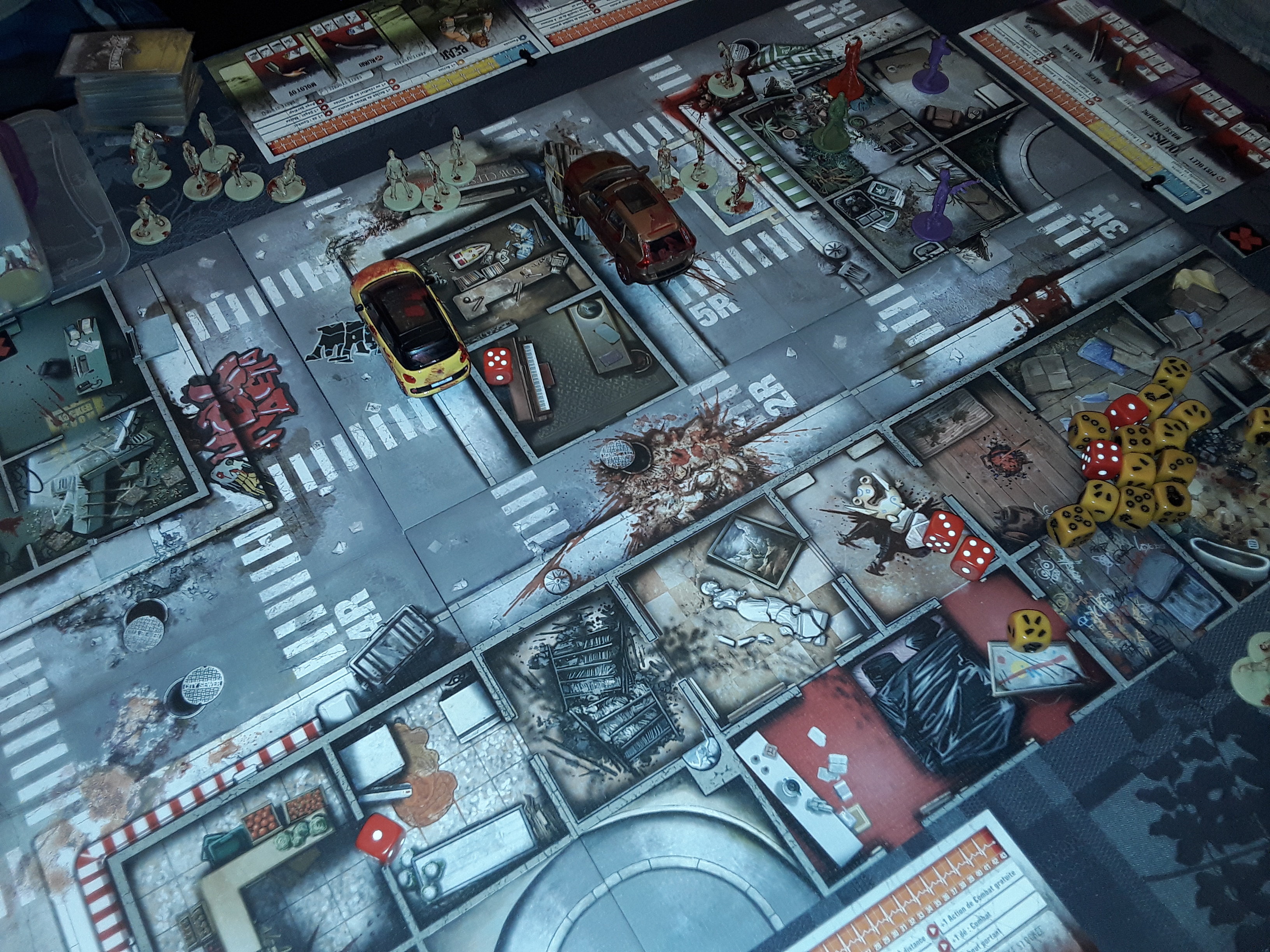 Une petite variante du scénario « Rond Point » qui est sympa pour initier les nouveaux joueurs aux bases de Zombicide. Ici pas de zone d’Invasion et pas de stress. Ne possédant pas la saison 1 j’ai utiliés les dalles de Rue Morgue.