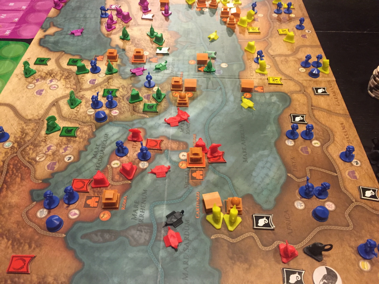 Une partie beaucoup plus militaire que la première, très intéressante où l’on a pu mesurer l’impact du choix d’ordre du tour à chaque phase, où la possibilité d’éviter les combats en méditérannée permet des contre-attaques par la mer et empêche quiconque de trop se protéger en défense. Mare Nostrum porte bien son nom : une flotte en méditerranée peut être la clef des mouvements et de la victoire !
