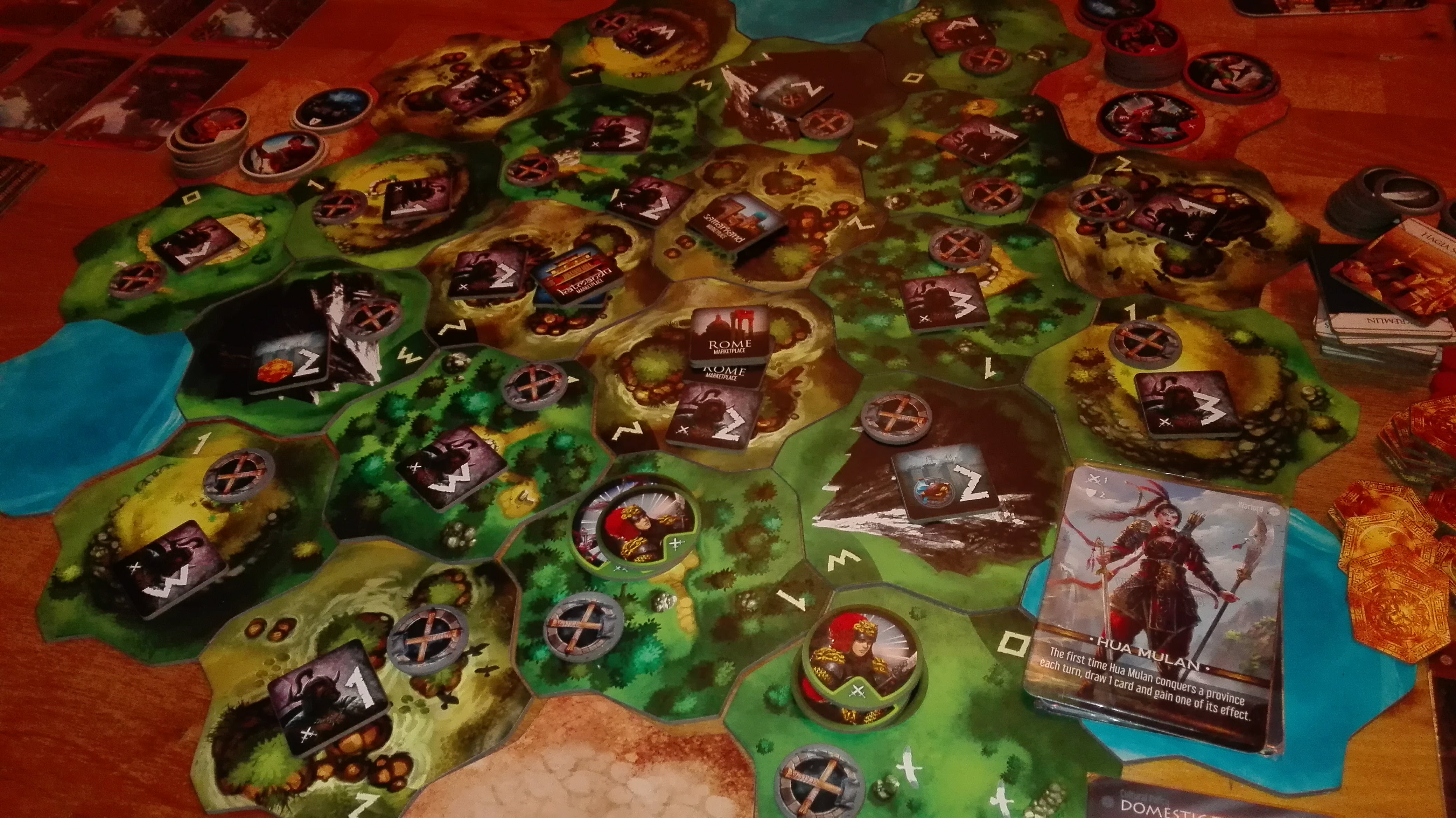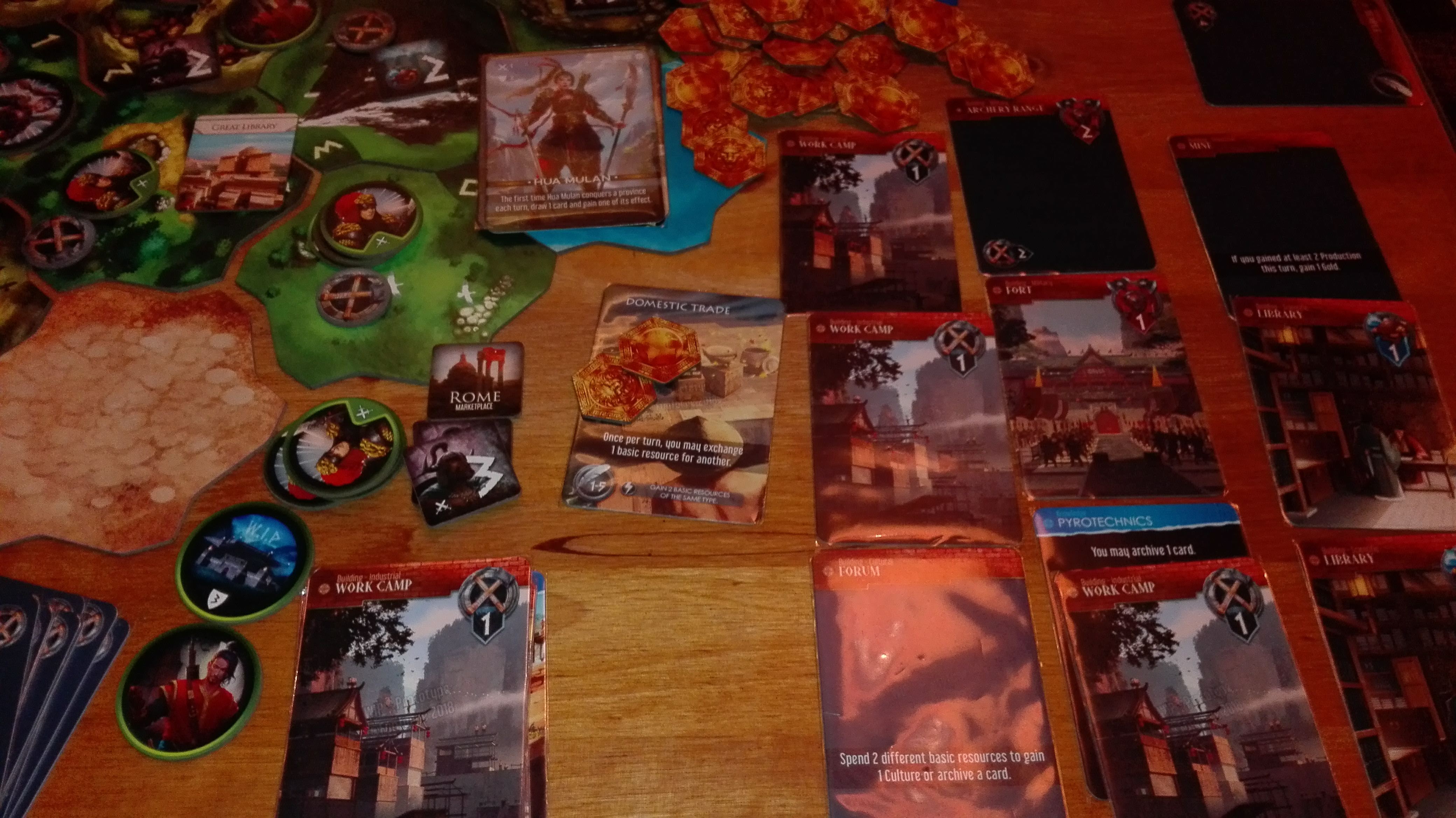Nouvelle mouture non définitive et sans figurine essayée lors d’une démo et le jeu de cartes/développement/conquête/combo m’a bien plu : c’est beau, riche, bien rejouable avec le plateau formé de tuiles modulaires, sans compter les différents peuples possédant une petite asymétrie (pouvoir de héros et une carte différente). Coté mécanismes, il mélange plusieurs principes bien à la mode : de gestion de ressources, de la conquête/combat simple/commerce, activation de cartes et deck-building avec une rivière de cartes à acheter (plus des bâtiments de base boostés) et bien-sûr des merveilles à construire. Notre ville est composée de 3×3 cartes et on active à son tour les cartes d’une même ligne et colonne (donc 5 cartes vois plus si carte bleue = culture se trouvant dessous est présente), on récupère les ressources produites pour acheter des cartes, se déplacer sur le plateau pour conquérir (d’abord des barbares puis ses adversaires) ou commercer, puis on défausse les cartes activées et jetons restants. Les cartes achetées vont directement sur le dessus de son deck donc des combos avec l’effet piocher sont possibles. Un peu d’attente à son tour sur les premières parties est à prévoir car chaque joueur réalise toutes ses actions en dépensant toutes ses ressources (car défaussées en fin de tour si inutilisées), cet effet doit s’atténuer lorsqu’on connait mieux les effets des cartes. En tout cas, le tour offre une grande liberté stratégique en multipliant les combos. Le jeu se déroule en 3 âges et un décompte final a lieu. On marque des points selon l’état de notre civilisation : tuiles contrôlées, cartes culture, merveille et majorité dans chaque ressource (comme dans Deus). J’ai trouvé le jeu à la croisée de plusieurs autres bons opus bien connus : 7 Wonders (pour le thème et côté combos), Deus (pour les mécanismes de ressources et tuiles modulaires) et Civilization (pour la partie conquête et commerce mais en bien plus simple et plus rapide). J’ai bien apprécié cette partie découverte et espère que Fun Forge réussira enfin son KS (ils ont pris en compte les remarques en proposant avec/sans figurines, c’est de bonne augure), le jeu en vaut la peine !