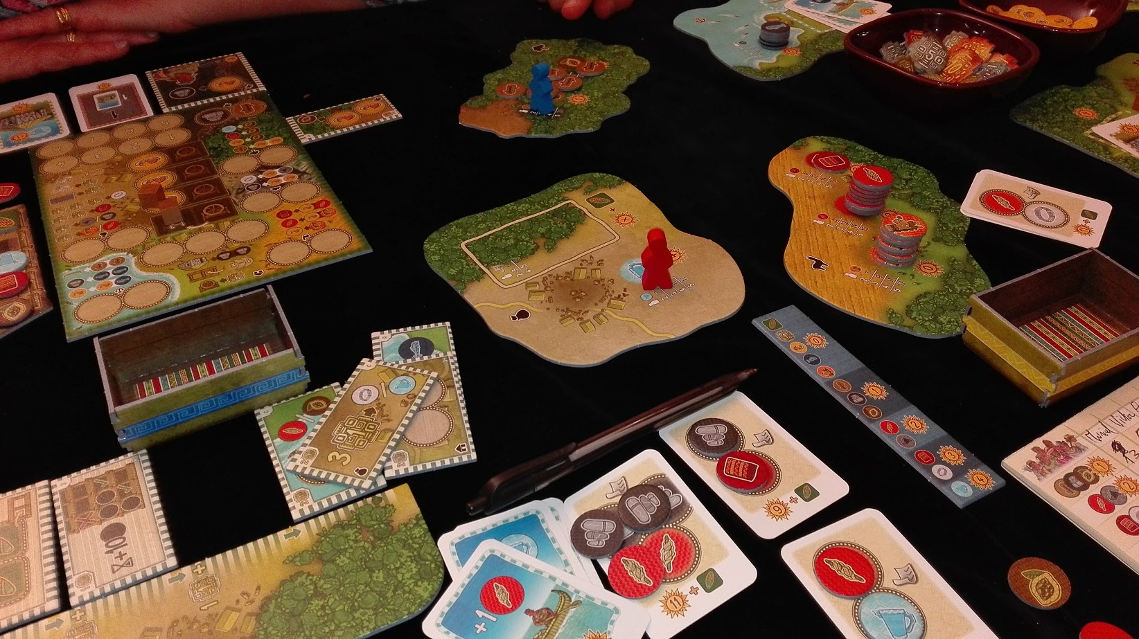 On a appliqué une variante non officielle proposée par Victor qui racourcit le jeu : il s’agit de toujours enlever la tuile extension du marché à chaque manche même si aucune n’a été prise. J’avoue que c’est pas mal et évite des derniers tours répétitifs.