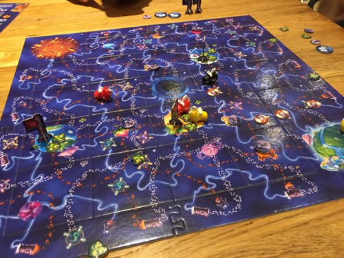 Je connaissais Edenia pour avoir joué sur son proto plus d’un an avant sa sortie et je fus hier très agréablement surprise du travail effectué sur l’équilibrage du plateau et les pouvoirs spéciaux. Côté visuel, les tuiles sont bien chargées et pas toujours hyper lisibles, mais les moutons sont vraiment fun. Cette partie familiale – avec notre fille de 6 ans – s’est très bien passée, avec retournements de situation, plantages et déplantages de drapeaux, pouvoirs spéciaux, transporteurs, il n’y a qu’une chose qu’on n’a pas tâté finalement et étrangement : le saute mouton ! Mais ça nous a donné une idée assez précise de ce que pouvait nous donner le jeu : pirouettes, prises de risque, et c’est bien dans la gamme de BLAM finalement qui a déjà sorti Celestia. Heureusement, car le jeu est pas si évident, un mode easy permet de jouer sans les pouvoirs (qui auraient bien profité d’une aide de jeu), on aurait peut-être du commencer par là pour MiniSha. Bref, on a bien aimé virevolter dans le trou noir et partir en exploration dans des coins risquées tout en essayant d’otpimiser un peu nos déplacements pour arriver en premier … sans lâcher les drapeaux des planètes habitables. Pas si simple mais fun en famille !