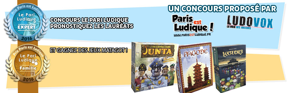 À l’instar de l’an dernier, nous allons vous présenter ci-après tous les prototypes qui seront en lice pour le concours du du Pari Ludique 2016. Et une fois que vous aurez tout bien regardé, vous aurez la possibilité de pronostiquer les 2 vainqueurs (1 jeu Famille et 1 jeu Expert) via notre petit formulaire de vote.