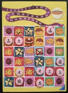 Dans Cookie Party, les joueurs disposent de la même grille composée de 8 ou 9 sortes de biscuits selon le côté du plateau, les cookies du titre étant les plus nombreux. Avant de démarrer la partie, chacun va placer onze jetons numérotés de 2 à 12 sur différentes cases. À chaque valeur est associée un nombre de traits que l’on va pouvoir tracer, en lien avec sa probabilité sur un jet de 2D6 : quatre traits pour le “2” et le “12”, trois traits pour “3” et “11”, jusqu’à un seul trait pour les valeurs plus fréquentes (5,6,7,8,9). Lors de chaque tour, une joueuse lance les deux dés et chacun pourra tracer son ou ses traits sur les bords de la case correspondante. Le but du jeu est de marquer un certain nombre de points en entourant toutes les cases biscuits d’un type donné. La première à compléter un groupe marquera plus de points que les suivantes.