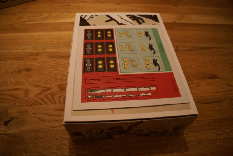 Et bien, non le matériel ne pullule pas ici. Le thermo et plutôt pensé comme un écrin… En ôtant les grands livrets de règles et d'aventures nous découvrons avec émerveillement deux sublimes bustes de Corto et Raspoutine. Il y a quelques planches à dépuncher et 6 plateaux en forme de fins rectangles (on en voit ici deux repliés, le bleu et le vert). Continuons…
