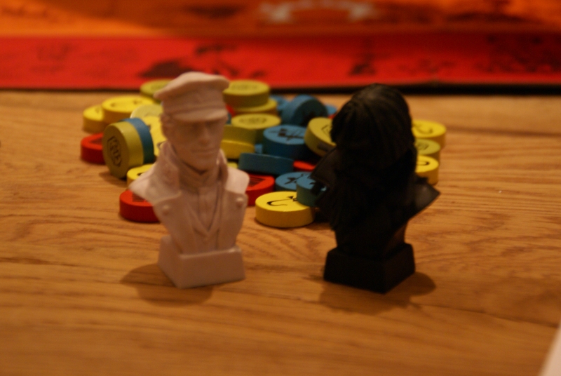 Derrière les bustes, on peut deviner la cinquantaine de jetons colorés. Ils serviront à marquer votre territoire !