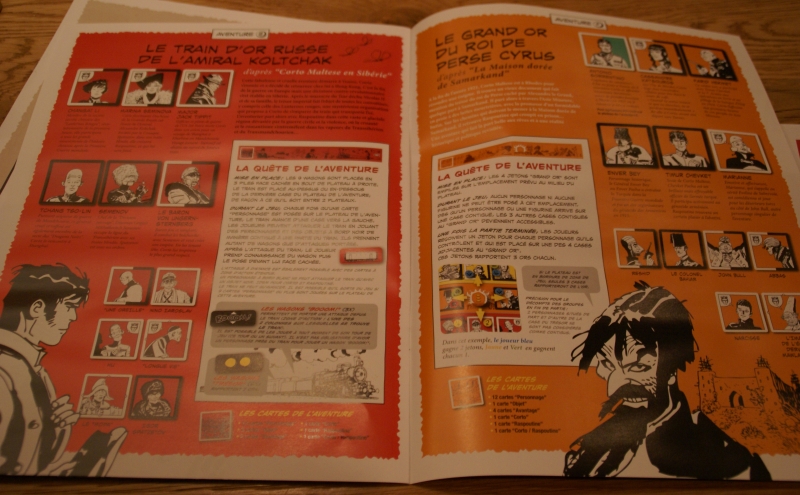 Chaque page du livret d'aventures explique le fonctionnement d'un des plateaux, les cartes et la quête spécifique à cette aventure. Comme je le disais précédemment, ces "quêtes" sont plutôt des objectifs qu'on va tenter de décrocher avant les autres et qui rapportent plus ou moins d'or. Cerise sur le gâteau, chaque plateau est tiré d'une BD qui nous est présentée en détails.