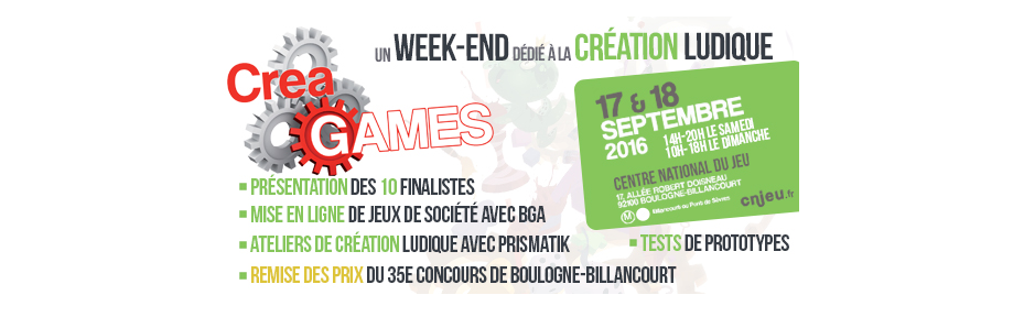 C‘est un des rendez-vous majeurs de la francophonie ludique qui vous attend les 17 et 18 septembre avec l’événement CreaGames et la remise des prix du 35e Concours de Boulogne-Billancourt. Vous ne saviez pas ce que alliez faire du week-end, n’est-ce pas ? Il suffisait de demander.