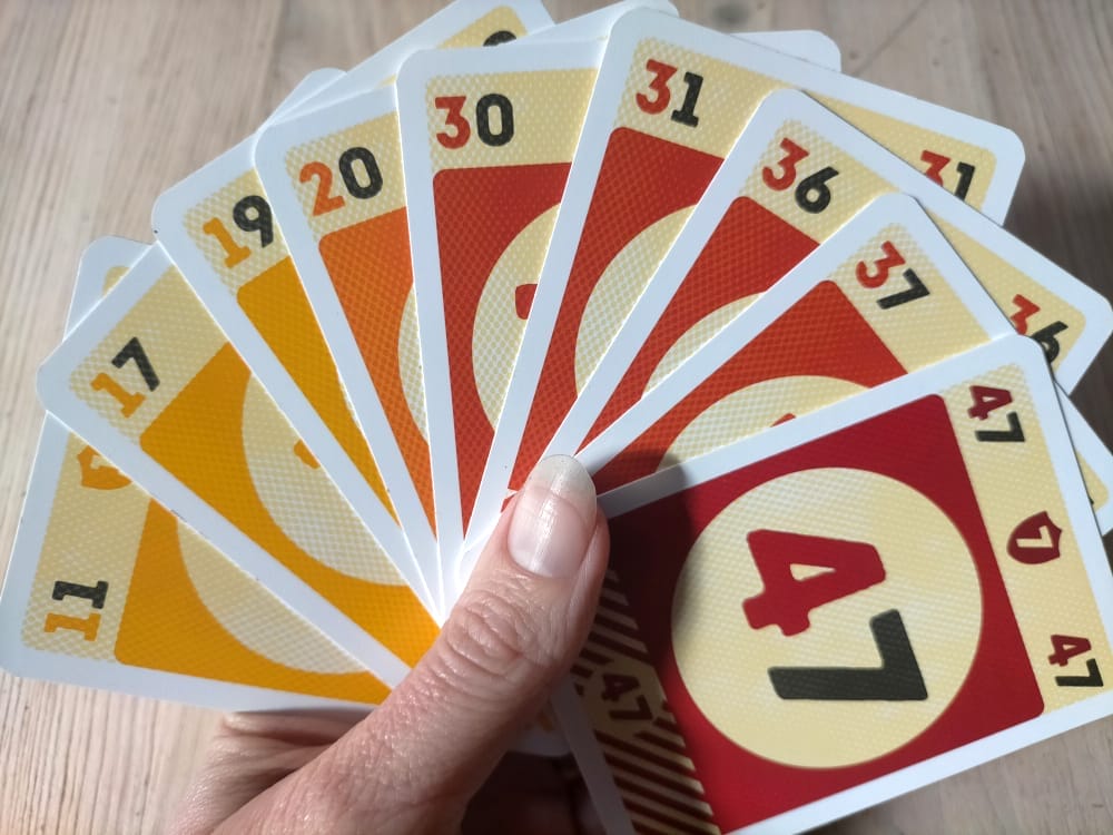 La base du jeu est un jeu de plis : la carte de plus forte valeur remporte les cartes. Ensuite ces cartes ne vont pas rester cachées, mais être exposées devant soi, par colonne de dizaine. En fin de manche, on va tout simplement scorer la carte de chaque dizaine de plus faible unité. Par exemple le 15 rapportera 5 points, le 22 2 points, et le 30 … 0 point.