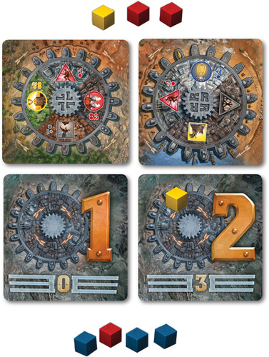 Quand on planifie, on prend ses cartes « engrenages » en main (de valeur 1 ou 2) et on les attribue face cachée sur nos deux roues d’action, à gauche et à droite. Quand on les révélera, il faudra tourner la roue du nombre de cran indiqué par la carte et cela nous informera de l’action permise (il y a 4 actions par roue). Pour modifier ces valeurs, vous pouvez sacrifier des ressources (magnifiquement incarnés par de sobres cubes en bois). Il est admis par exemple, de poser un soldat ou une denrée sur le dos de votre carte : cela vous accordera une marge d’action de +1/-1. Autrement dit, vous pourrez tourner votre engrenage un peu plus ou un peu moins, si c’est plus clair dit comme ça. Bon.