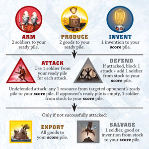 1/ Armer, produire, inventer : vous permet de gagner des ressources (2 soldats, 2 denrées, 1 invention) ;