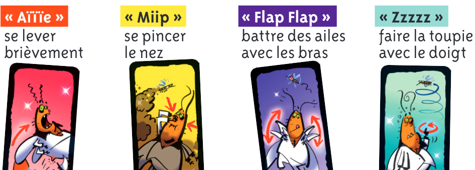 Hop. On a chacun sa petite pile de cartes et à son tour, hop, on en retourne une. On doit alors hop hop appliquer la consigne indiquée qui consiste à faire un mouvement débile tout en faisant des bruits chelous.