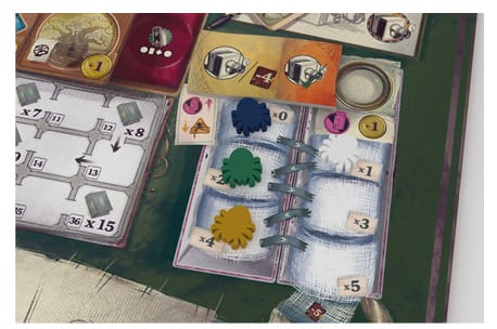 Après la phase de correspondance (vous savez celle où l’on résout les majorités sur les timbres) viendra le moment où vous devez assumer les conséquences de vos actes. Au-dessus de la piste de danger, une tuile du même nom vous inflige un malus et des points de victoire si vous ne pouvez pas gérer ce malus. Vous avez voulu faire le kakou, vous en payez le prix. Et si vous n’avez pas de points de victoire, ne vous inquiétez pas pour cela, ils sont notés par un marqueur araignée et seront décomptés à la fin. Toutefois le joueur qui a plus avancé sur cette piste de danger gagnera un bonus qu’il pourra utiliser quand bon lui semblera.