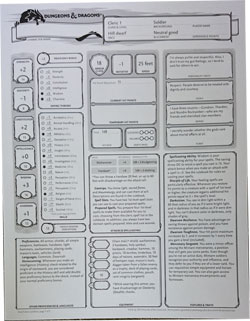 Ensuite viennent 6 caractéristiques (Force, Dextérité, Constitution, Intelligence, Sagesse et Charisme) qui serviront à déterminer la réussite ou l’échec des actions entreprises par les personnages. Suivent une liste de compétence dans lesquelles le personnage est efficace. Par exemple le voleur maitrise la compétence de Stealth (Discrétion ou Furtivité en bon françois, utile pour se cacher).