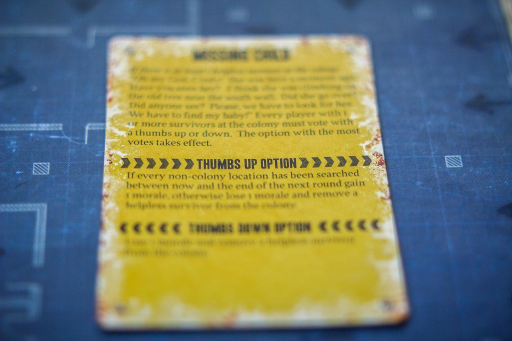 Par exemple, une carte fait découvrir un cheval à un joueur. Le joueur peut le garder, ce qui lui donnera la possibilité de bouger de lieu en lieu sans courir de risque, ou il peut tuer le cheval, ce qui remplira les stocks de nourriture de la colonie toute entière.