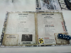 La boite de Dead of winter est pleine de cartes, d’un plateau central (le refuge), des plateaux d’autres lieux à visiter et des personnages de zombie et de héros en carton. Ce dernier point est un peu décevant.