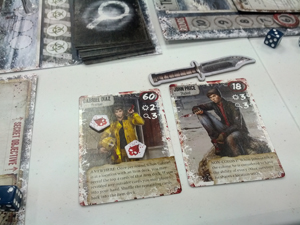 L’un des joueurs peut justement être dévoué à la cause zombie (mais les chances que ce soit le cas semblent rares). Autres aspects qui participent à l’ambiance : lorsque c’est au tour d’un joueur, le joueur précédent pioche une carte d’événement qui pourra se déclencher si le joueur actif fait ce qui est décrit par la carte piochée. Et enfin, nos personnages vont probablement mourir durant le scénario. Pas d’inquiétude, il est possible d’en trouver d’autres en fouillant les lieux. Avoir plusieurs personnages facilite beaucoup la vie (le joueur aura une action par tour par personnage) mais compliquera les choses pour ce qui est des quantités de nourriture nécessaire à la survie du groupe.