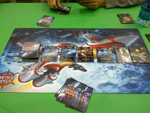Au programme des jeux de société du jour, j’ai pu tester le jeu de cartes Star Realms (qui peut facilement être testé au format numérique gratuit avec achat in-app sur Android et sur iOS). Le jeu est un deckbuilding classique puisqu’il reprend les mécanismes de Ascension [normal, on retrouve Rob Dougherty aux manettes]. Chacun va construire son paquet de cartes à partir des cartes présentes dans la ligne centrale.