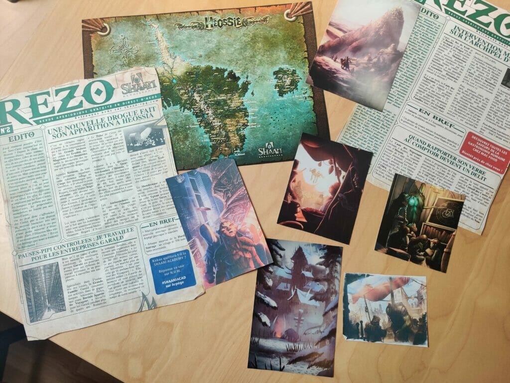Ce sont des journaux périodiques que vous pouvez imprimer ou créer vous-même, des cartes à punaiser au mur ou à étaler sur la table, le décret de la ville, le calendrier de telle divinité, le serment du paladin, le blason de la guilde… Tout ce qui permettra aux joueurs de s’immerger un peu plus dans l’ambiance. Et il y a du choix ! On peut aussi compléter avec des éléments connexes : par exemple, pour le JdR Hollow Earth Expedition, j’ai imprimé des images de vieux magazines et des publicités de l’époque du jeu, j’en ai collé sur mon écran et les autres étaient disposées sur la table.