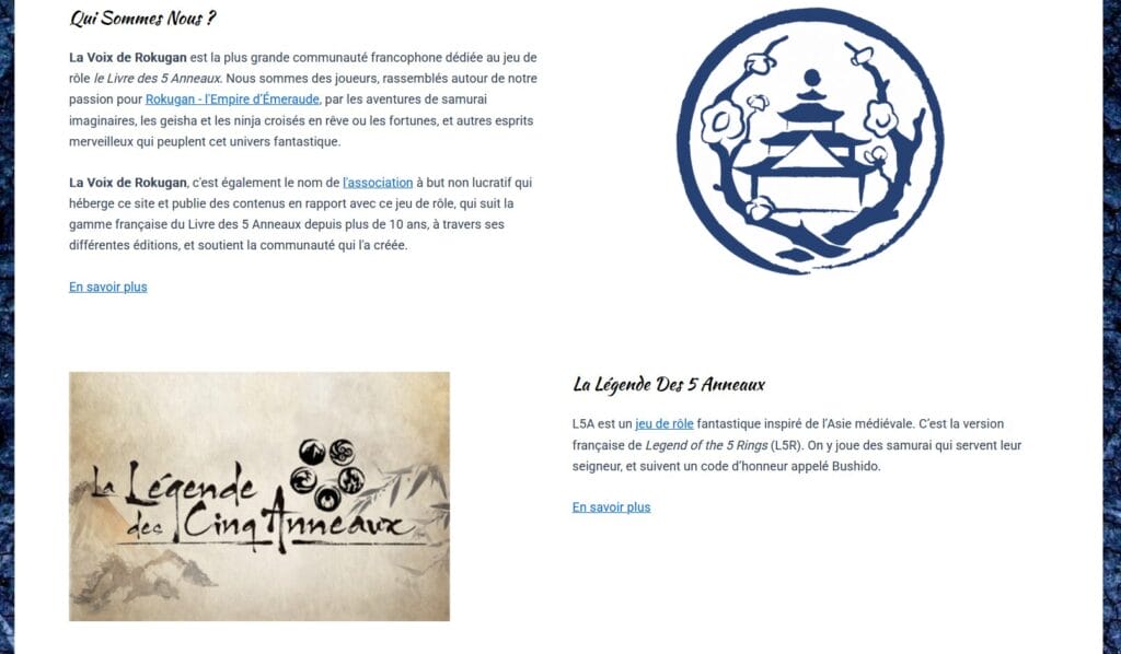 Ce site, créé par une association de passionnés, propose foule d’informations sur l’excellent JDR fantastique Le livre des 5 Anneau, inspiré de l’Asie médiévale où nous jouons des saumurais suivants le code d’honneur (le Bushido) appartenants à un clan, qui a ses règles et sa hiérarchie.